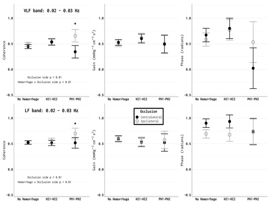 Impairment in the cerebral autoregulation within the first 24 h after a stroke onset was also associated with a hemorrhagic transformation (Figure 2). Among patients who had data from less than 24 h after the LSW time, coherence was increased within both the VLF and LF frequency ranges on the ipsilateral side compared to the contralateral side in those who had a parenchymal hematoma hemorrhage (PH1 and PH2), as defined using the ECASS II criteria [36] on a CT scan at approximately 24 h post therapy (VLF: hemorrhage type p = 0.63, occlusion side and hemorrhage × occlusion interaction p < 0.01; LF: hemorrhage type p = 0.73, occlusion side p < 0.01, and interaction p = 0.01). There were no significant differences in the gain (VLF: hemorrhage type p = 0.59, occlusion side p = 0.97, interaction p = 0.82; LF: hemorrhage type p = 0.84, occlusion side p = 0.70, interaction p = 0.76) or the phase (VLF: hemorrhage type p = 0.34, occlusion side p = 0.50, interaction p = 0.52; LF: hemorrhage type p = 0.95, occlusion side p = 0.15, interaction p = 0.76) in the <24 h after the LSW time period. There were no statistically significant differences in any of the transfer function parameters relative to the hemorrhage during any of the other time points.