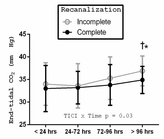 The end-tidal CO2 levels were shown to demonstrate a temporal trend with higher levels in patients with incomplete recanalization (TICI 2b or less) compared with TICI 3. This was statistically significant after 96 h, p = 0.03 (Figure 3).