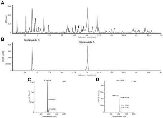 Ultra-high-performance liquid chromatography coupled with quadrupole time-of-flight mass spectrometry (UPLC-QTOF/MS) in negative-ion mode analysis. (A) Base peak intensity (BPI) chromatogram of Liriope platyphylla extract (n-butanol fraction), (B) overlay chromatogram of two standard compounds, (C) mass spectrum of spicatoside A, and (D) mass spectrum of spicatoside D.