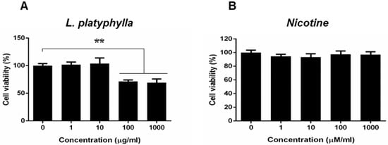 Dose-dependent cell viability of PC12 cells treated with L. platyphylla extract and nicotine. cytotoxicity of (A) L. platyphylla and (B) nicotine. One-way ANOVA followed by Tukey’s post hoc test was used for statistical analysis. ** p < 0.01 versus vehicle control. N = 3, independent cultures.