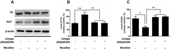 Effects of L. platyphylla on the nicotine-induced alterations in the expressed protein levels of tyrosine hydroxylase (TH) and dopamine transporter (DAT) in PC12 cells. (A) Representative blots for expression of TH and DAT proteins in PC12 cells. Quantification of expressed protein levels in (B) TH and (C) DAT 24 h after co-treatment of L. platyphylla and nicotine. One-way ANOVA followed by Tukey’s post hoc test was used for statistical analysis. * p < 0.05 and ** p < 0.01 versus vehicle + nicotine group. N = 3, independent cultures.