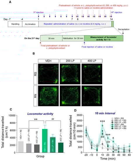 Effect of L. platyphylla extract on repeated nicotine-induced behavioral sensitization in rats. (A) Experimental timeline for behavioral assessment. Blue arrows represent subcutaneous injection of saline or nicotine. Red dotted arrows represent oral pretreatment of vehicle or L. platyphylla extract prior to each saline or nicotine injection. (B) Representative locomotion tracking patterns for 60 min after the final saline or nicotine administration. (C,D) Changes in locomotor activity are expressed as total distance travelled following the final administration of saline or nicotine after pretreatment of vehicle or L. platyphylla extract. One-way or two-way ANOVA, followed by Tukey’s post hoc test or Bonferroni’s post hoc test, respectively, were used for statistical analysis. * p < 0.05, ** p < 0.01, and *** p < 0.001 versus VEH + RS group. ## p < 0.01 and ### p < 0.001 versus VEH + RN group. RS, repeated saline; RN, repeated nicotine; VEH, vehicle; 200 LP, 200 mg/kg L. platyphylla extract; 400 LP, 400 mg/kg L. platyphylla extract.