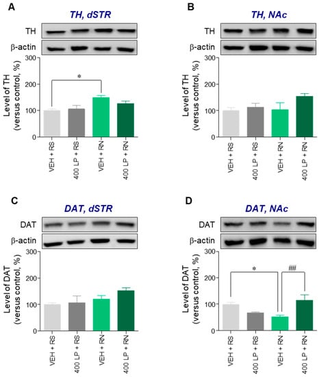 Effect of L. platyphylla extract on repeated nicotine-induced alternations in TH and DAT protein expression in the dorsal striatum (dSTR) and nucleus accumbens (NAc) of rats. (A–D) Representative blots and quantification of expressed protein levels in TH and DAT of the dSTR and NAc following the final administration of saline or nicotine after the pretreatment of vehicle or 400 mg/kg L. platyphylla. One-way ANOVA followed by Tukey’s post hoc test was used for statistical analysis. * p < 0.05 versus VEH + RS group. ## p < 0.01 versus VEH + RN group. RS, repeated saline; RN, repeated nicotine; VEH, vehicle; 400 LP, 400 mg/kg L. platyphylla extract.