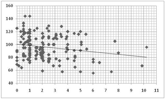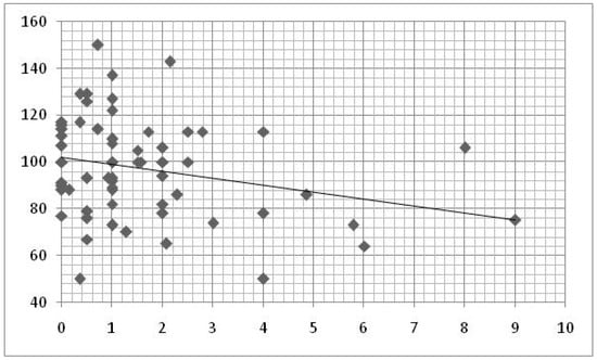 Linear regression between time of DD use by the children and Lexical Quotient. x axis = hours/day of DD use; y axis = Lexical Quotient scores.