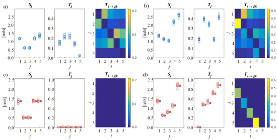 The information storage (Equation (9)) can be considered as a measure of self-predictability for the jth source, quantifying the amount of information shared between the present and the past dynamics of the source process. The information transfer (Equation (9)), or total Granger causality, is a measure of the amount of information contained in the present state of the jth source that can be predicted by the past states of all the other sources. Finally, the conditional information transfer (Equation (9)), or conditional Granger causality, is a measure of the amount of information contained in the present state of the jth source that can be predicted by the past states of the ith source above and beyond the information that can predicted from the other sources. More details about information dynamics measures can be found in [33] and in references therein.