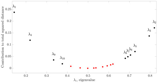 Contribution to the total squared Riemannian distance provided by the eigenvalues corresponding to each spatial filter () of the CSP matrix obtained for the generalized seizures trials classified as and . Black and red dots identify the selected spatial filters and the discarded filters, respectively.