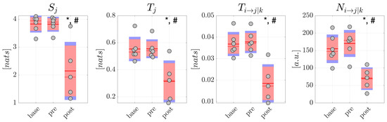 Information dynamics of scalp EEG signals measured during generalized seizures. Panels report the boxplot distribution and individual subject values (average over network nodes and trials) of the information storage , total information transfer , conditional information transfer , and number of significant links in the three analyzed conditions , , . Statistically significant differences between pairs of distributions: *, p < 0.05 vs. ; #, p < 0.05 vs. .