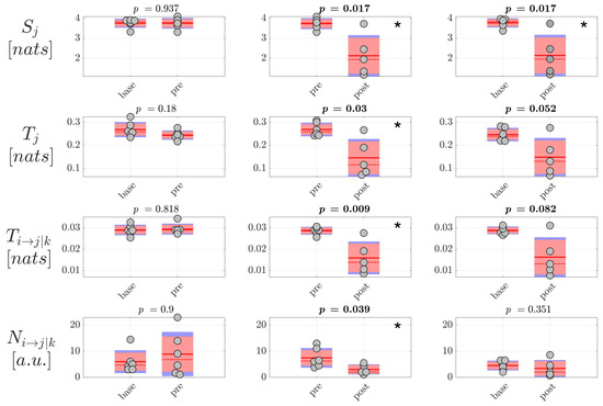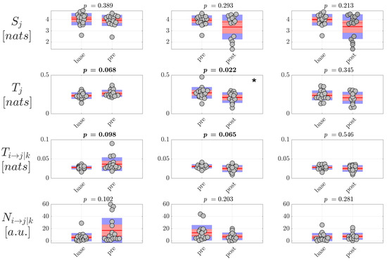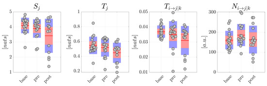 Afterwards, the distributions across subjects obtained for each information measure were analyzed to infer statistical differences between pairs of classes (i.e., , , ). Statistical analysis was carried out using the nonparametric two-sided Wilcoxon rank-sum test. The obtained p-values were not corrected for multiple comparisons, but this does not affect the analysis given the small number of comparisons and, with regard to source signals, since the unmixing is specific for each pair of classes compared and thus results in different distributions.