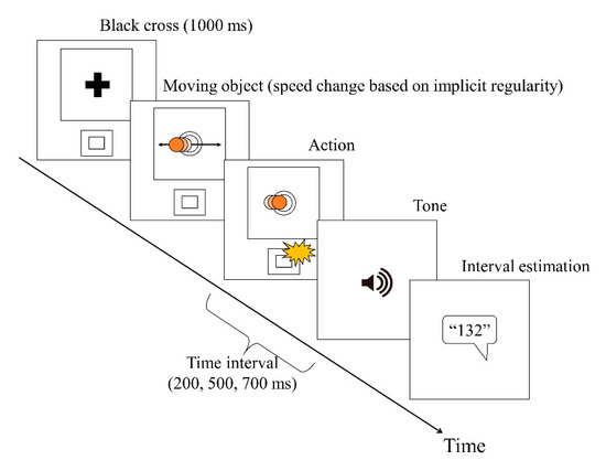 We arranged the previous study [25] of an IB task with implicit regularity in a perceptual-motor task. First, a black fixation cross was presented on the screen for 1 s. Next, a red, circular, flat object repeatedly moved horizontally across the screen. The participants pressed a key when the object reached the center of the screen. The object had a radius of 20 px, and the circle in the center of the screen had a radius of 30 px. The target stopped moving as soon as the participant pressed the key, and after a time interval, a sound was presented. The participant estimated the time interval between pressing the key and hearing the sound. As in the time baseline task, a time interval of 200, 500, or 700 ms, respectively, was chosen randomly for each trial, and participants verbally estimated the time interval between pressing the key and hearing the sound. This task comprised of 10 blocks (18 trials per block). For participants noticing the implicit regularity of the perceptual-motor task, we changed the moving speed of the object. The moving speed (visual angle) was in five stages (Speed 1, 7.09 degrees/s; Speed 2, 14.13 degrees/s; Speed 3, 21.06 degrees/s; Speed 4, 27.84 degrees/s; and Speed 5, 34.43 degrees/s). The speed was gradually changed from Speed 1 to Speed 5 every 1 s. After Speed 5, the speed was set to Speed 1 again. This loop was repeated until the participants pressed a key. As a result of the preliminary experiments, by setting the regularity, we were able to divide the participants into two groups: the noticing group, who noticed the regularity, and the non-noticing group, who did not notice the regularity. Notably, the participants had no knowledge of the regularity before the experiment. After completing all trials, the participants answered questions regarding whether and when they noticed the implicit regularity. On the basis of the answers, we clearly divided the participants into two groups: the noticing group, who noticed the regularity, and the non-noticing group, who did not notice the regularity (see Figure 1).
