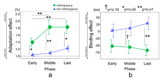 (a) Adaptation effect for each group in each phase. 1.0 indicates the baseline. (b) Binding effect for each group in each phase. The data represent the means ± standard error; † indicates a p-value < 0.1; * indicates a p-value < 0.05; ** indicates a p-value < 0.01; green square plot = noticing group; blue triangle plot = non-noticing group.
