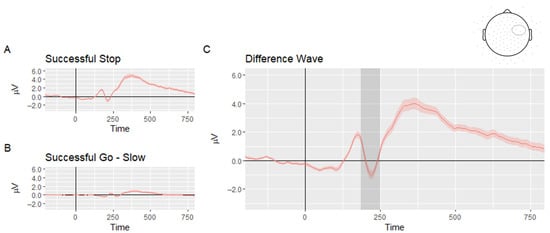 In stop-signal locked ERP, there is some overlap with ERP activity arising from the previous go stimulus; although this activity may be suppressed, it is not entirely eliminated by the averaging process. One approach that can solve this problem is to calculate difference waves in which the go stimulus ERP is subtracted from the stop-signal ERP [82,83]. According to the horse-race model, slower RTs for the go signal are related to successful inhibition, and faster RTs for the go signal are related to failed inhibition [84]. Therefore, go trials were divided based on the participants’ median RT to “slow” and “fast” go trials [85]. We followed the procedures reported in O’Halloran et al. [85] and Palmwood et al. [82] and subtracted the slow-go ERP from the successful stop ERP. This difference wave (i.e., stop minus slow go) was used in further analyses. To evaluate the effect of successful inhibition, the mean amplitudes of the N2 were measured. Based on previous findings on the N2 in the SST [34] and after inspection of the grand average ERP of the difference wave between a successful stop and successful slow go (see Figure 1), a time window was selected around the peak of the N2 (180–250 ms), and the right anterior frontal region of interest was used by averaging six electrodes between the standard sites C4 and F8 [31,34]. The split-half reliability of the N2 was 0.77.