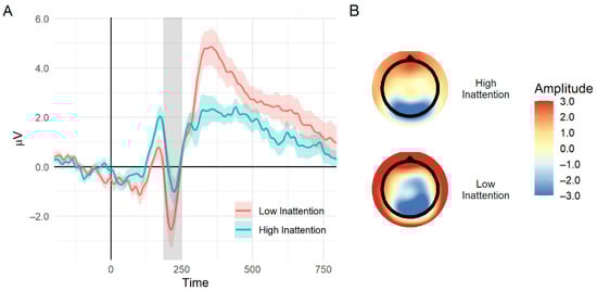(A) An illustration of the event-related potential wave plot of the difference between a successful stop and successful slow go for adolescents with high and low concurrent inattention symptoms (group defined by the lower and upper quartile). The gray area delineates the N2 time window; the shaded area represents standard error. (B) Topographic maps of voltages on the scalp at the N2 time window (specifically at 200 ms after stop-signal presentation) for high (top) and low (bottom) concurrent inattention symptoms.