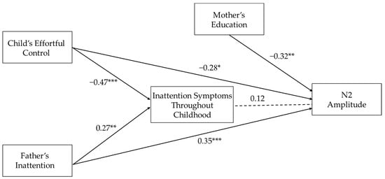 A longitudinal pathway from early risk to N2 amplitude at 17 years of age. Note: * p < 0.05, ** p < 0.01, *** p < 0.001; Standardized estimates of the paths were used; significant paths are represented with solid lines, and insignificant paths are represented with dotted lines.