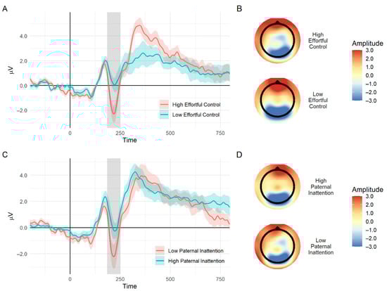 (A) An event-related potential wave plot of the difference between successful stop and successful slow go for adolescents with high and low ratings of childhood effortful control (group divided into lower and upper quartiles for illustration purpose). The gray area delineates the N2 time window; the shaded area represents standard errors. (B) Topographic maps of voltages on the scalp at the N2 time window (specifically at 200 ms after stop-signal presentation) for high (top) and low (bottom) childhood effortful control. (C) An event-related potential wave plot of the difference between a successful stop and successful slow go for adolescents with high and low paternal inattention symptoms (group defined by the lower and upper quartile). (D) Topographic maps of voltages on the scalp at the N2 time window for high (top) and low (bottom) paternal inattention.