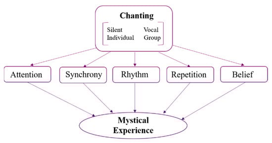 Figure 1 depicts the most common characteristics of chanting, illustrating how structural features of music, belief systems, focused attention, and behavioural aspects of chanting converge to induce mystical states.