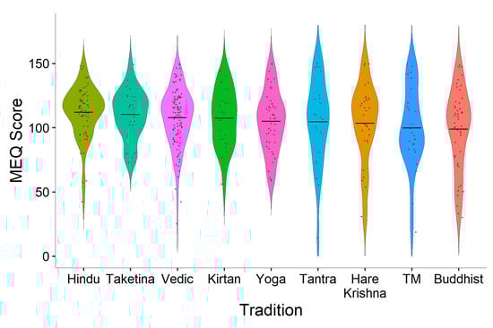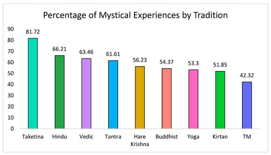 A total of 60% of participants scored over 60% on all factors of the MEQ30 and therefore met the criterion for a complete mystical experience associated with their chanting practice [56,58]. Figure 2 displays the percentage of participants within the main reported traditions who reported having a complete mystical experience.
