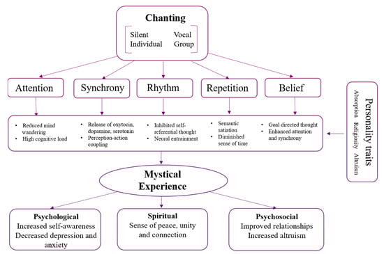Capacities of chanting (attention, repetition, synchrony, rhythm, and belief) work both individually and together, leading to neurocognitive functions that are associated with mystical states. Attention and repetition promote disengagement from automatic thoughts, reduced mind wandering, and can diminish a sense of time through semantic satiation, when a phrase temporarily loses its meaning [68,82,83]. Rhythm and synchrony promote perception–action coupling and neural entrainment, as well as inhibit self-referential thought [41,84]. Further, synchronous music activities lead to neurohormonal changes, such as increased dopamine, serotonin and oxytocin [47,48]. The release of these hormones also plays an important role in psychoactive induced altered states and, in the trait, absorption [50]. Lastly, traits we found to be positively associated with mystical states may enhance some of the capacities of chanting in our model. For example, absorption could promote higher levels of attention; altruism may encourage synchrony and rhythm; and religiosity may enhance both attention and synchrony.