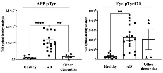 APP Tyr phosphorylation (APPpTyr) increases in fibroblasts from AD patients but not in patients with other forms of dementia or in healthy controls. The left panel reports the optical density analysis of APP pTyr bands, expressed as the mean optical density ratio between APP pTyr and APP basal levels from each sample in AD neurons (square) vs. healthy (circle) controls and other dementias (triangle). ** p < 0.005 and **** p < 0.0001, one-way ANOVA followed by Tukey’s test. The right panel reports the densitometric analysis of the bands expressed as the mean optical density (OD) ratio of Fyn pTyr420 relative to basal Fyn levels. ** p < 0.005, one-way ANOVA followed by Tukey’s test.