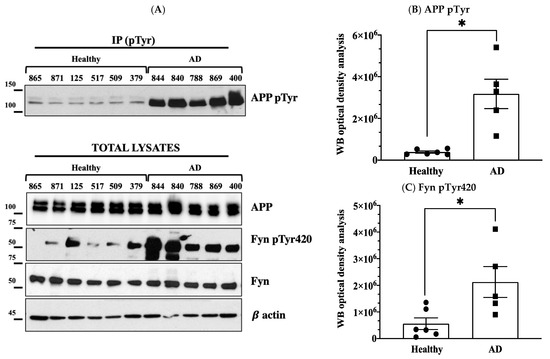The levels of phosphorylation of APP Tyr were assessed using the same procedure previously applied to neurons [2,3] and consisting of immunoprecipitating the total lysates with mouse anti pTyr conjugated beads and analysing samples by Western blot (WB) using anti APP antibody. Although this procedure is not selective for APP Tyr682 residue (APP has indeed other two Tyr(s) whose changes in the phosphorylation can also easily be detected by the same procedure), previous findings from our group proved that only APP Tyr682 residue phosphorylation is crucial in initiating APP amyloidogenic processes in AD neurons, whereas Tyr phosphorylation at different APP sites does not affect the extent of A𝛽 production or accumulation [8,9]. The increase in APP Tyr phosphorylation was analysed with respect to the basal APP expression levels in the total lysate of each sample (Figure 1, Figure 2, Figure 3 and Figure 4). In addition, the Fyn Tyr420 phosphorylation was also assessed as an indirect measure of Fyn TK activity [13], and the results were normalised on Fyn basal expression levels (Figure 1, Figure 2, Figure 3 and Figure 4).