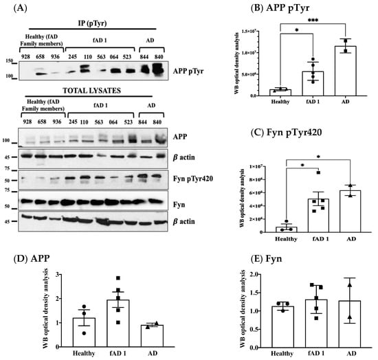 APP Tyr phosphorylation increases in fibroblasts from familial AD type 1 (fAD 1) and AD patients compared to healthy controls with a history of fAD 1. Panel (A) shows WB analyses of APP pTyr, Fyn pTyr420, APP and Fyn in healthy donors (circle) patients with a diagnosis of fAD 1 (square) and AD (triangle). Panels (B–E) report the densitometric analyses of the bands shown in panel (A). In particular, panel (B) reports the optical density analysis of APP pTyr bands expressed as the mean optical density ratio between APP pTyr and APP basal levels from each sample. * p < 0.05; *** p < 0.001. Panel (C) reports the ratio of FynpTyr420 relative to basal Fyn levels. * p < 0.05, one-way ANOVA followed by Tukey’s test. APP and Fyn expression levels, normalised on β-actin values, are reported in panels (D,E).