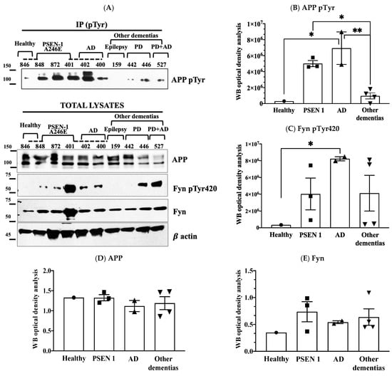 APP Tyr phosphorylation increases in fibroblasts from AD patients or in patients carrying PSEN 1 mutation, but not in patients with other forms of dementia or in healthy donors. Panel (A) shows WB analyses of APP pTyr, Fyn pTyr420, basal APP and Fyn levels. Panel (A) in particular reports data from one healthy donor #846 with his sibling #848 who carried PSEN1 A246E mutation (indicated with a discontinued line); the PSEN1 A246E genotype was also present in patients #872 and #401; patients #400, #401 and #402 were siblings, and are indicated by the discontinued line; patients #159 had a diagnosis of epilepsy for their entire life, however post-mortem histologic analysis revealed an AD phenotype; patients #442 and #446 were PD, whereas #527 was clinically diagnosed with PD, however after death brain histology indicated an AD phenotype. Panel (B) reports the optical density analysis of APP pTyr bands expressed as the mean optical density ratio between APP pTyr and APP basal levels from each sample in fAD 1 and AD fibroblasts vs. healthy controls and other dementias. * p < 0.005; ** p < 0.001, one-way ANOVA followed by Tukey’s test. Panel (C) reports the ratio of pFyn Tyr420 relative to basal Fyn levels. The graph represents the densitometric analysis of the bands expressed as the mean optical density (OD). * p < 0.005, one-way ANOVA followed by Tukey’s test. APP and Fyn expression levels are reported in panels (D,E). β actin values were used as loading controls.