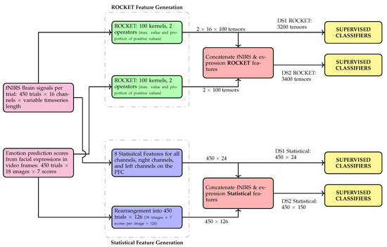 The motivation for using the two aforementioned DSs is to establish whether accuracy of expertise classification is improved when fNIRS data is used in tandem with predicted emotion scores data (DS2) in comparison to when only fNIRS data is used (DS1). In addition, the classification prowess of the supervised classifiers are also gauged when these classifiers are given statistical features in comparison to random convolutional kernel transform (ROCKET) [38] features. A flowchart depicting the overall classification paradigm is presented in Figure 5. More details on the feature generation, both statistical and ROCKET features, and the classifiers used are presented in the following sections.