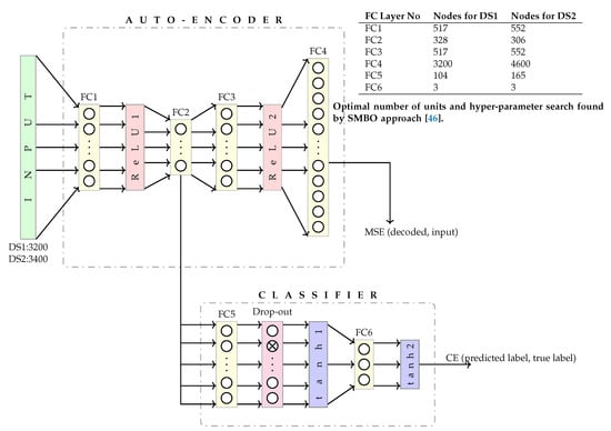 Figure 6. Deep Classifier AutoEncoder (DCAE) architecture with optimal number of units and hyper-parameter search found by SMBO approach [46].