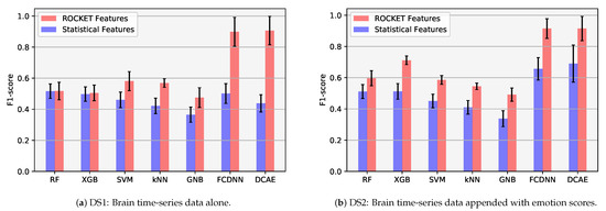 Across all classifiers, the maximum increase in classification accuracy on inclusion of expression data (i.e., the difference between DS1 and DS2) is for XGB with a percentage increase in classification accuracy by 40.87%. To appreciate the improvement in classification accuracy on inclusion of emotion scores, a bar chart for the F1 scores for all classifiers for both DS1 and DS2 is also plotted in Figure 7. As can be seen in Figure 7, the height of the bars on the right hand sides bar graph is greater, in comparison to those on the left hand side, for most of the classifiers, indicating an overall trend of increase in the classification prowess of the classifiers on inclusion of emotion scores. Nevertheless, this improvement is less pronounced for deep models, which sustain a satisfactory level of recognition with brain data only as well. Overall, the increase in F1-scores is only slight for most classifiers, and as is also reported in Table 4b not statistically significant for all classifiers.