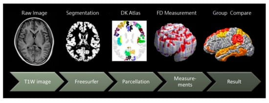 FD measurement is a sensitive method for describing the atrophy of cortical structures in neurologic and psychiatric conditions []. Studies using voxel-based morphometry (VBM) have found a globally reduced GM volume, but inconsistent results have emerged in identifying regional changes in neurodegenerative disease [,]. The VBM method is a whole-brain technique that employs spatial normalization and tissue classification to discern tissue concentration differences in structural MRI []. VBM is used for qualitative analysis, and is suitable for group-based comparison, but not for individual assessment []. In this study, the 3D-FD measure obtained using the DK atlas can be used for the complete anatomical analysis of the brain and can detect a single-person ROI for cortical alteration in specific regions. We speculate that our method is better at predicting the risk of developing a degenerative disease before the symptoms appear, which is significant for developing effective and personalized medicine.