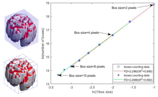 The FD is a quantitative indicator of object complexity (or irregularity), which can be calculated on the basis of different metrics, namely the Hausdorff dimension and box-counting dimension. In this study, we used the box-counting method for additional morphological estimation to evaluate the complexity (or irregularity) of the human brain. We extended the 2D box-counting method in the HarFA software to a 3D method for measuring the FD values of the human cortical brain []. According to the power law relationship, the FD of a fractal is defined as N(r) ∝ r −FD, where is the total number of boxes required to completely cover the fractal object with boxes of a different size, , and can be rewritten as: ; thus, the value of FD can be estimated from the slope of the line between and ).