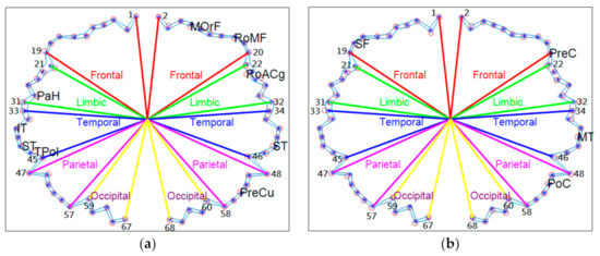 Figure 6a,b illustrates the scatter plots of the pre-diagnosis system for middle-age men (Figure 6a) and women (Figure 6b). In Figure 6a, a blue star represents each cortical subregion for men in the middle-age group; the distance from the center to the blue star is the mean FD value of each cortical subregion. The left and right parts of the figure illustrate the subregions of the left and right hemispheres, respectively. Each subregion is arranged in the order mentioned in Table 2. The subregions of the frontal lobe (1–19 and 2–20) are depicted by red lines, subregions of the limbic cortex (21–31 and 22–32) are depicted by green lines, and so forth. The distance from the center to the otter contour blue line is equal to the blue star FD value plus its standard deviation, and the distance from the center to the inner contour blue line is equal to the blue star FD value subtracted by its standard deviation. The red dots indicate the FD values of each subregion of one participant (participant 37 from men in the middle-age group, Figure 6a). As in Figure 6a, the subregions with significantly smaller FD of the test participant were labeled (PaH, IT, ST, TPol, MOrF, … in Figure 6a). We defined if the FD value of each subregion of the test participant was smaller than his/her peer group, with the FD value of the blue star (mean FD value of the index of the identical subregion) subtracted by the standard deviation; these significantly smaller subregions are labeled as the susceptive of abnormal subregions. In Figure 6a, the labeled regions indicate that participant 37 from the men in the middle-age group had significant morphological alterations in his left temporal and right frontal lobes compared with his age-matched peers. Figure 6b shows significantly smaller subregions in participant 37 from the women in the middle-age group compared with her age-matched peers. Participant 37 from the women in the middle-age group exhibited four subregions of significantly smaller FD values, whereas participant 37 from the men in the middle-age group exhibited nine subregions of significantly smaller FD values. Thus, we may suggest that our proposed FD values using the DK atlas-based pre-diagnosis system is a suitable tool for comparing and pre-assessing symptoms of normal aging or neurodegeneration between groups or in individual participants.
