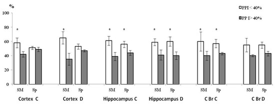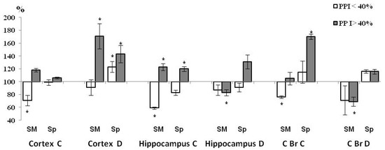 ChAT activity distribution (means ± SEM%) in the HBH sub-groups of rats with. PPI< and >40% 4 min after the end of hypoxic training. As in Figure 2, the total activity of enzyme in any sub-fraction of the control group is taken as 100%. Cortex, neocortex; C Br, caudal brainstem; C, the fraction of light synaptosomes; D, the fraction of heavy synaptosomes; SM, the sub-fraction of synaptic membrane; Sp, the sub-fraction of synaptoplasm. * Significant differences between values of ChAT activity in sub-groups. * p < 0.05, Wilcoxon-Mann-Whitney test (u-criterion) and Fisher’s exact test (FET-criterion).