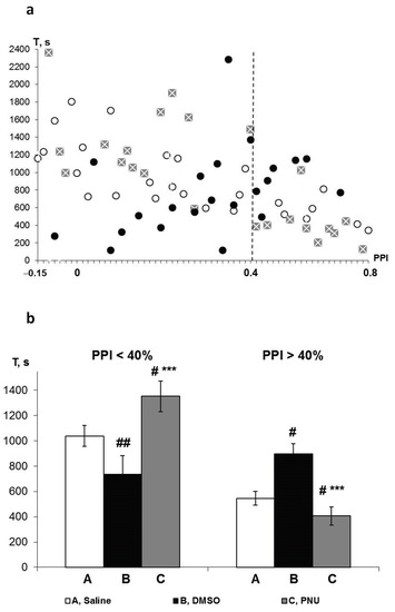 Therefore, we subdivided the pharmacological study data into sub-groups with PPI < 40% and PPI > 40% and compared the quantitative differences in average T values between the saline, PNU and DMSO sub-groups (Figure 5b). According to the averaged data, the influence of both PNU and DMSO on the T values in both saline sub-groups was significant and opposite with respect to each other. Thus, the greatest differences were observed between the PNU and DMSO sub-groups.
