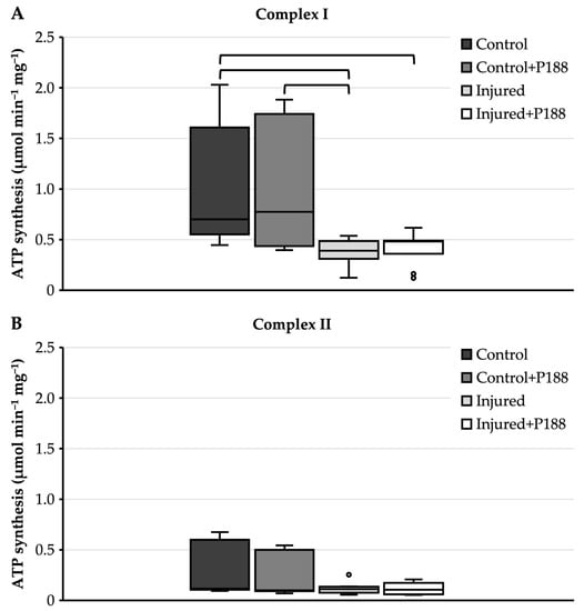 After 10 min RT, median ATP synthesis of control mitochondria for complex I substrates was at 3 and 3.2 µmol min−1 mg−1 without and with P188, respectively (Figure A4A in the Appendix A). Injured mitochondria showed significantly lower ATP synthesis than control mitochondria at a median of 1.1 µmol min−1 mg−1 without as well as with P188.