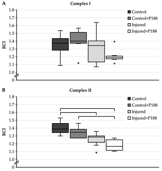 Respiratory control index (RCI) of oxygen (O2) consumption in hydrogen peroxide (H2O2)-injured, isolated mitochondria for complex I (A) and II (B) substrates in control, control + Poloxamer (P)188, injured, and injured + P188 mitochondria. Boxplots show 25th, 50th, and 75th percentile; whiskers represent minimum and maximum. Statistical significance (p < 0.05) denoted by brackets; complex I: n = 6, complex II: n = 5.