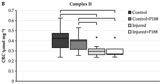 For complex II substrate (Figure 3B), control mitochondria showed a median CRC of 0.42 µmol mg−1 and an interquartile range from 0.33 to 0.47 µmol mg−1 (Figure 3B). With a median of 0.4 µmol mg−1, the CRC of P188-treated control mitochondria was not significantly lower than control mitochondria without P188. Injured mitochondria, however, showed a median CRC of 0.3 µmol mg−1 and 0.27 µmol mg−1 without and with P188, respectively, and these were significantly lower than in control mitochondria, independently of treatment with P188.