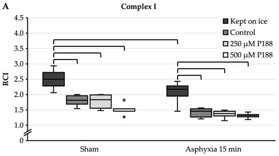 For complex I substrates (Figure 4A), sham mitochondria that were completely kept on ice showed a median RCI of 2.5. In mitochondria kept on ice, asphyxia of 15 min significantly decreased RCI to 2.2. Under sham conditions, control, 250 µM P188, and 500 µM P188 mitochondria showed a significantly lower RCI, between 1.5 and 1.8, compared to sham mitochondria that were kept on ice. Similarly, in the 15 min asphyxia condition, the RCI of control, 250 µM P188, and 500 µM P188 mitochondria was significantly reduced to between 1.3 and 1.5 compared to mitochondria kept on ice. Furthermore, with 15 min of asphyxia, a seeming decrease in RCI in control, 250 µM P188, and 500 µM P188 mitochondria compared to the sham condition was not significant.