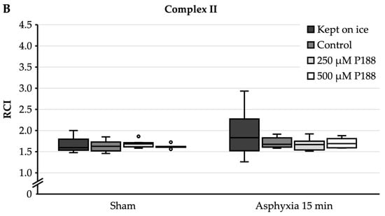 For complex II substrate (Figure 4B), sham mitochondria that were completely kept on ice showed an RCI of 1.6. Asphyxia of 15 min led to an RCI of 1.8, with no significant differences being found. Control, 250 µM P188, and 500 µM P188 mitochondria showed no significant differences to each other or to mitochondria kept on ice, neither within their condition nor outside.