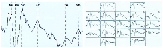 Figure 10 presents a particular example of ERP registration in the perception of an identifiable image in a patient with meningioma of the left parietal lobe. There is a pronounced asymmetry in the distribution of waves with predominant activation on the affected side. If the N150 wave forms independently everywhere, the later waves in the 300–800 ms interval tend to merge without splitting into separate waves.