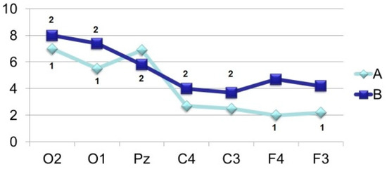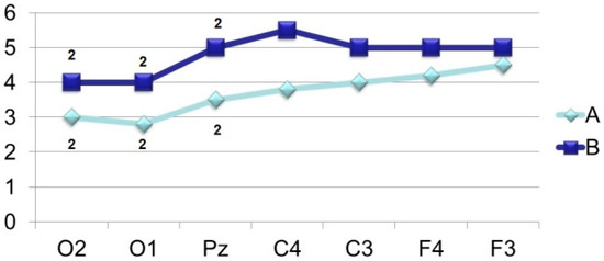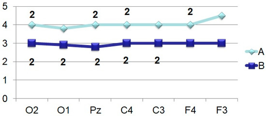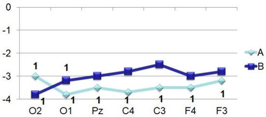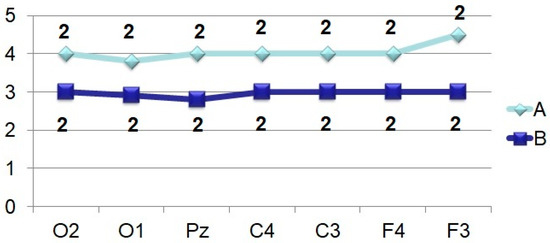 The amplitude-time characteristics of evoked potentials were processed using two main types of multivariate analyzes–stepwise discriminant (to establish the main differences in amplitudes and peak latencies) and factorial (to assess the stability of these indicators) (BMDP Statistical Software). The final result for stepwise discriminant analysis is the F-criterion. Differences were considered significant at F > 4.0. Factor analysis was chosen as the second method for determining the stable and unstable characteristics of the evoked potentials, where the criterion for determining the serial number of a factor is the stability of the parameter. The most stable characteristics are shown in Figures 3–9. Such an approach in physiological studies is justified from the point of view that dispersion, being an indicator of stability, is a characteristic of the quality of regulation in biological systems and, especially, in brain structures [20]. At the start the data from all 19 leads were evaluated according to the 10–20 system. Subsequent analysis showed that to solve the tasks of establishing the role of the components, data on 7 points are sufficient. The discussion of the results is based on the presence or absence of differences, as well as the stability of amplitudes and peak latencies.