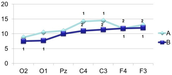 Averaged values of amplitudes and factor characteristics of amplitudes and PL of the N70 ERP component during the perception of recognizable (A) and unrecognizable (oddball) (B) images. On the abscissa–points according to the 10–20 system, on the ordinate–amplitude, uV. Figures on the graphs: 1–maximum factor number for amplitude, 2–maximum factor number for PL.