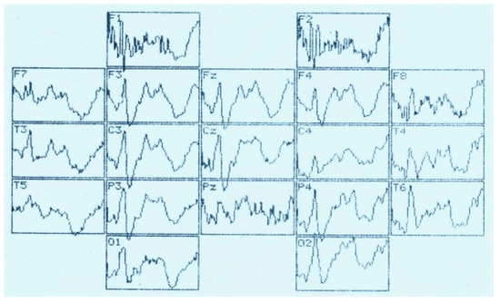 In right-sided meningioma ERP (Figure 12) in response to recognizable visual image a “destroyed” evoked potential is formed with an uneven manifestation of waves with a PL of 100–150 ms (N150). Late waves (300–800 ms) tend to either decrease significantly or merge.
