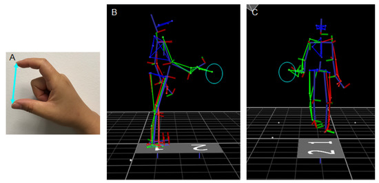 (A) A participant used her index finger and thumb to form a C-shaped pose to allow her hand aperture to be determined. The examiner measured the distance (cyan line) between the finger tips as the length of the participant’s hand aperture. (B) A skeleton figure, depicted in the sagittal plane to show a representative reaching while standing trial when the participant reached a target box (cyan circle). The target was set at one arm’s length from the participant in alignment with the midline of his body to allow him to bend forward to reach and lift the target. (C) A skeleton figure depicted in the frontal plane to show a representative walking-for-reaching trial prior to the participant reaching the target box (cyan circle). The participant reached the box with his trunk facing forward and the right arm slightly extended to the right.