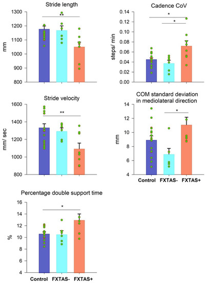 Mean differences in stride length, stride velocity, percentage of double support time, cadence coefficient of variation (CoV), and center of mass (COM) standard deviation in the mediolateral direction between the control (blue), FXTAS− (cyan), and FXTAS+ (orange) groups. Error bars represent standard errors. * p < 0.02. ** p < 0.01.