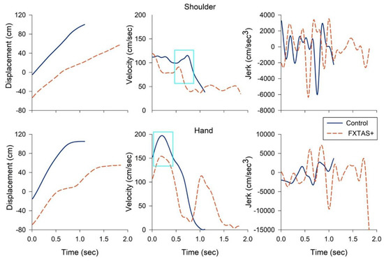 Representative kinematic profiles of the shoulder (top) and hand (bottom) of a 65-year-old patient with FXTAS (dashed orange line) and an age-matched healthy control (solid blue line) when they walked to reach and lift the small box. The FXTAS patient showed a prolonged reaching duration (left), decreased maximum reaching velocity of the shoulder and hand (middle, highlighted in a cyan box), and more oscillatory and jerkier joint movement (right) relative to the control participant. Time series were graphed from the reaching onset to offset. Jerk trajectories are shown in absolute values (cm/s3).