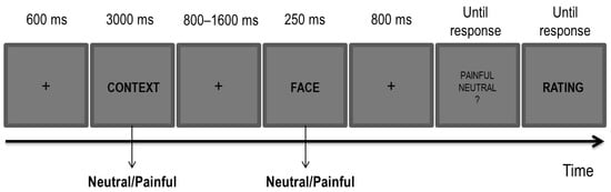The task and the stimuli were the same as those used in the author’s previous study (Figure 1; []). The stimuli included 32 Caucasian faces of 8 females and 8 males with either a neutral or painful expressions [], and 32 sentences describing either a neutral or a painful context (e.g., “This person owns a yellow car” for the neutral context; “This person got a finger hammered” for the painful context). The stimuli were presented at the centre of the screen on a 19” LCD monitor controlled by a computer running E-prime 2 software [] from a viewing distance of approximately 70 cm.