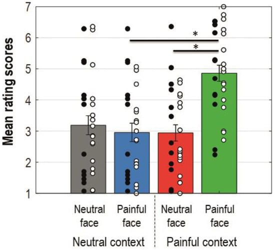 Previous studies, using the Empathy Task [], have shown an additive effect in non-clinical participant responses. Namely, painful faces, compared to neutral faces, have elicited the experience-sharing component of empathy, as reflected by the positive shift of only the relatively early P2 and N2–N3 components time-locked to face onsets. On the other hand, painful contexts elicited the mentalizing component of empathy compared to neutral contexts, as reflected by the positive shift of only the relatively later P3 component time-locked to face-onsets (see also other works from one of the authors and other groups in this field: [,,,,,,,]).