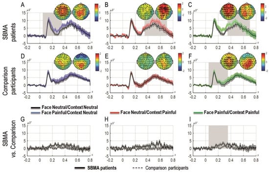 Figure 3 shows the grand averages of the ERP components time-locked to the onset of the face as a function of the context recorded at the sites that formed a cluster. Each experimental condition is presented superimposed with the ERPs elicited in the neutral condition (i.e., neutral context and neutral facial expression) from the left to the right (i.e., left panel: neutral context and painful facial expression; middle panel: painful context and neutral facial expression; right panel: painful context and painful facial expression). The two topographies for each graph represent the scalp activity in the early and late time-windows. Panels A, B, and C show results from the patients with SBMA, panels D, E, and F show the results from the controls and panels G, H, and I show the differential ERPs computed as the difference of each experimental condition minus the neutral condition for the SBMA patients and the controls.