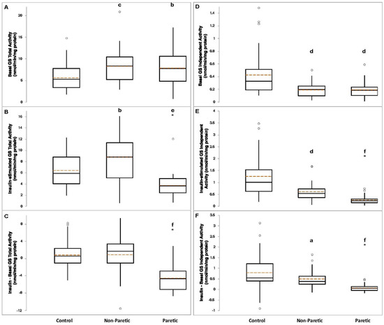 Basal panel (A), insulin-stimulated panel (B), and absolute change (insulin-stimulated minus basal, panel (C) glycogen synthase (GS) independent activities in control (n = 34–35), nonparetic (n = 24–28), and paretic (n = 26–29) muscle samples). Basal panel (D), insulin-stimulated panel (E), and absolute change panel (F) GS total activities in control (n = 33–35), nonparetic (n = 26–28), and paretic (n = 27–29) muscle samples. Boxplot legend: height of box = interquartile range (IQR); top of box = the 75th percentile (Q3); bottom of box = the 25th percentile (Q1); solid center line = median; dashed red line = mean; vertical line = range of data; open circles = outliers (<Q1-[1.5*IQR] or >Q3+[1.5*IQR]). Classical ANOVA with Fisher pairwise probabilities panels (A,C); Welch’s ANOVA with Welsh’s pairwise probabilities panels (B,D–F). a, p < 0.05; b, p = 0.01; c, p < 0.005; d, p < 0.0005; e, p < 0.0001; f, p < 0.00001 compared to control. * significantly different from nonparetic, p < 0.0005.