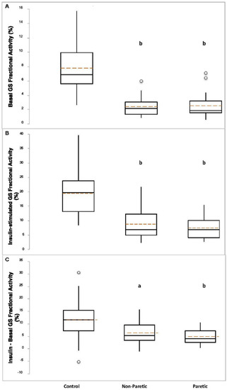 Basal panel (A), insulin-stimulated panel (B), and absolute change panel (C) GS fractional activities in control (n = 28–35), nonparetic (n = 26–35), and paretic (n = 26–35) muscle samples. Boxplot legend: height of box = interquartile range (IQR); top of box = the 75th percentile (Q3); bottom of box = the 25th percentile (Q1); solid center line = median; dashed red line = mean; vertical line = range of data; open circles = outliers (<Q1-[1.5*IQR] or >Q3+[1.5*IQR]). Welch’s ANOVA with Welsh’s pairwise probabilities. a, p < 0.0005; b, p < 0.00001 compared to control.